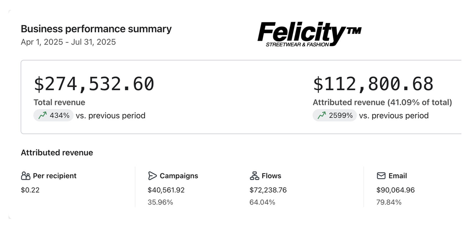 Felicity Worldwide - Before working with us, this hat brand had no Email or SMS backend set up and was generating $0 from Email and SMS. After working with us, now they have generated an extra $112,800 and increased their revenue by 430%!