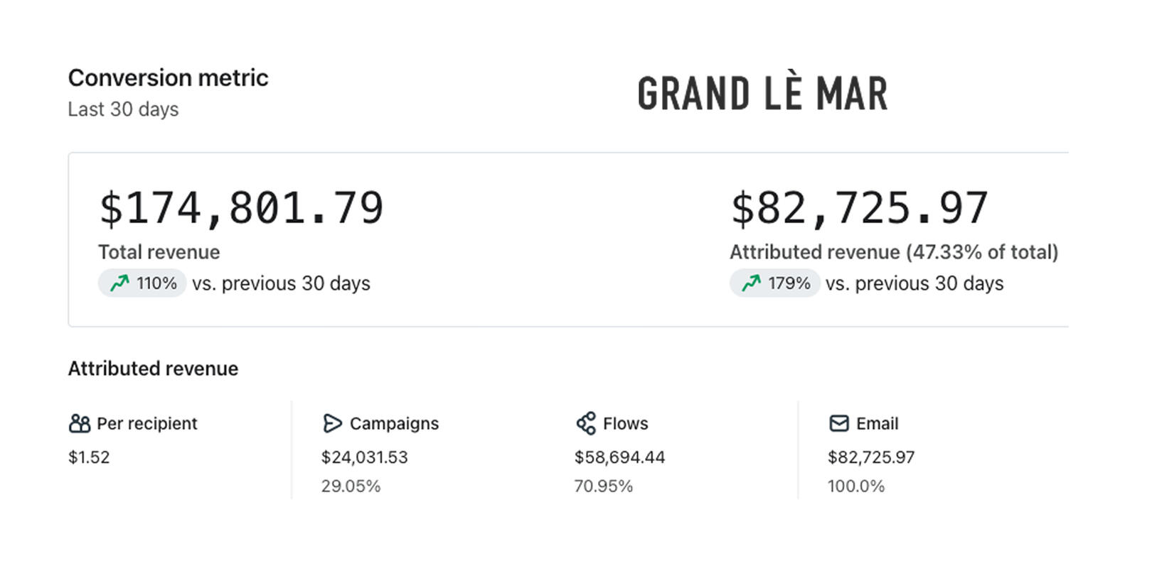 Grand Lè Mar - Within 30 days of working with this clothing brand, we generated $82,725 from Email Marketing, a 179% increase from their previous month!